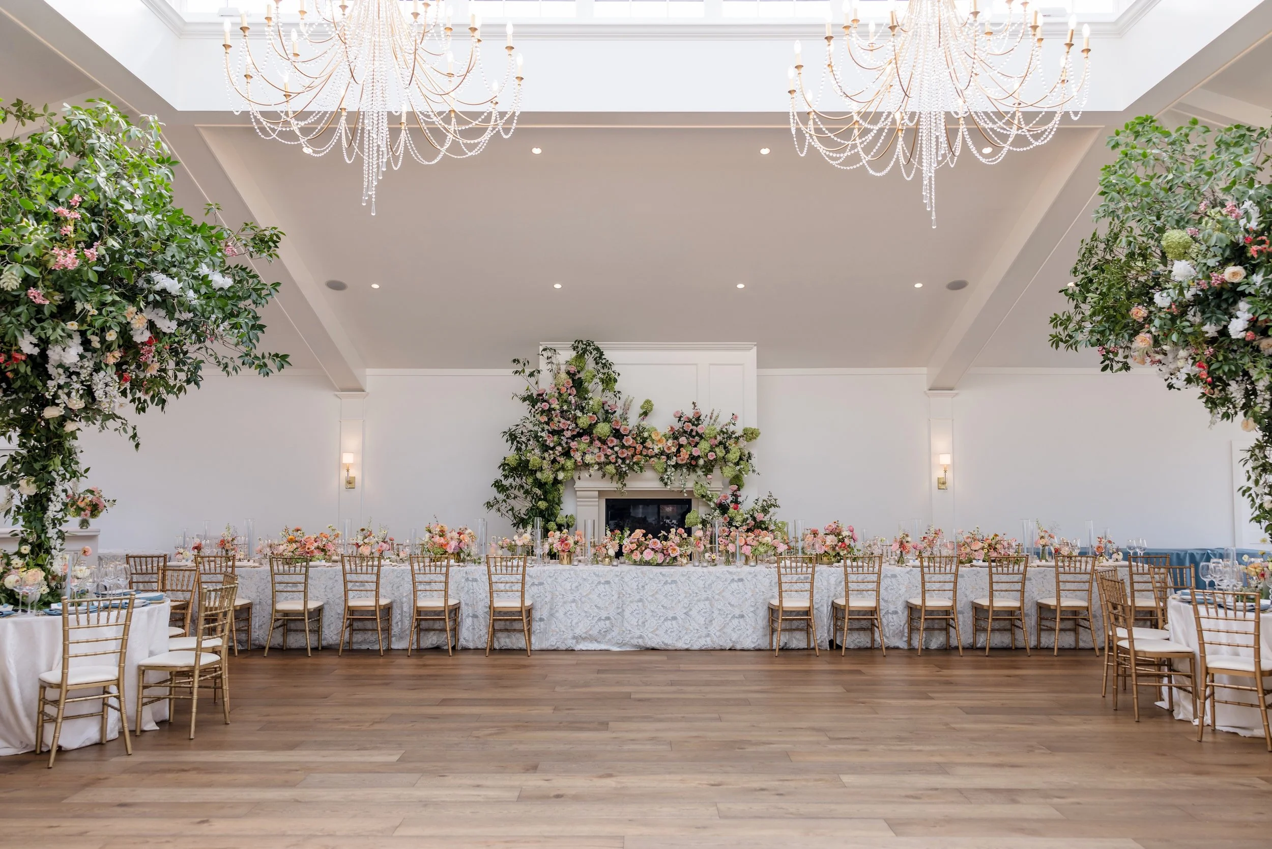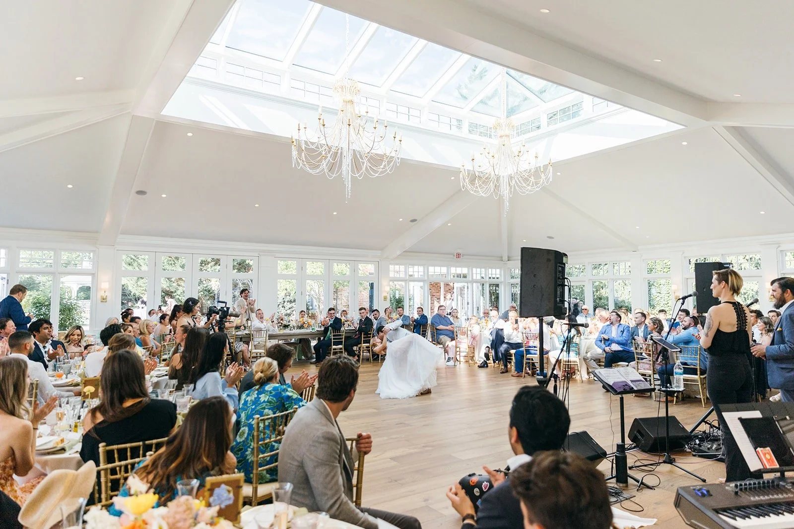 Our beautiful conservatory, featuring three sides of windows and french doors, a large beautiful sky light, a fireplace, hard wood floors throughout, and two gorgeous chandeliers and uplighting , accommodates 185 guests for a seated celebration. Within the house, our elegant rooms seat up to 50 guests.